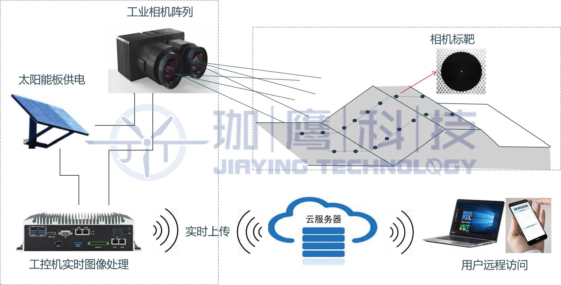 利用固定工業(yè)相機及工業(yè)攝影測量技術(shù),可實現(xiàn)較大范圍的高精度變形實時監(jiān)測與預(yù)警,精度可達亞毫米級。該方案可廣泛應(yīng)用與隧洞、邊坡、大壩、高聳結(jié)構(gòu)等變形監(jiān)測中。